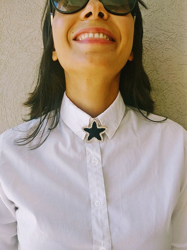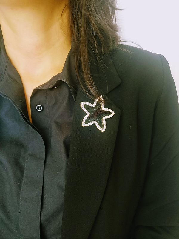 El broche tiene incorporado un imán y viene con su imán compañero decorado con cinta. Este se utiliza en el interior de la prenda permitiendo un agarre seguro y práctico, sin dañar la prenda.